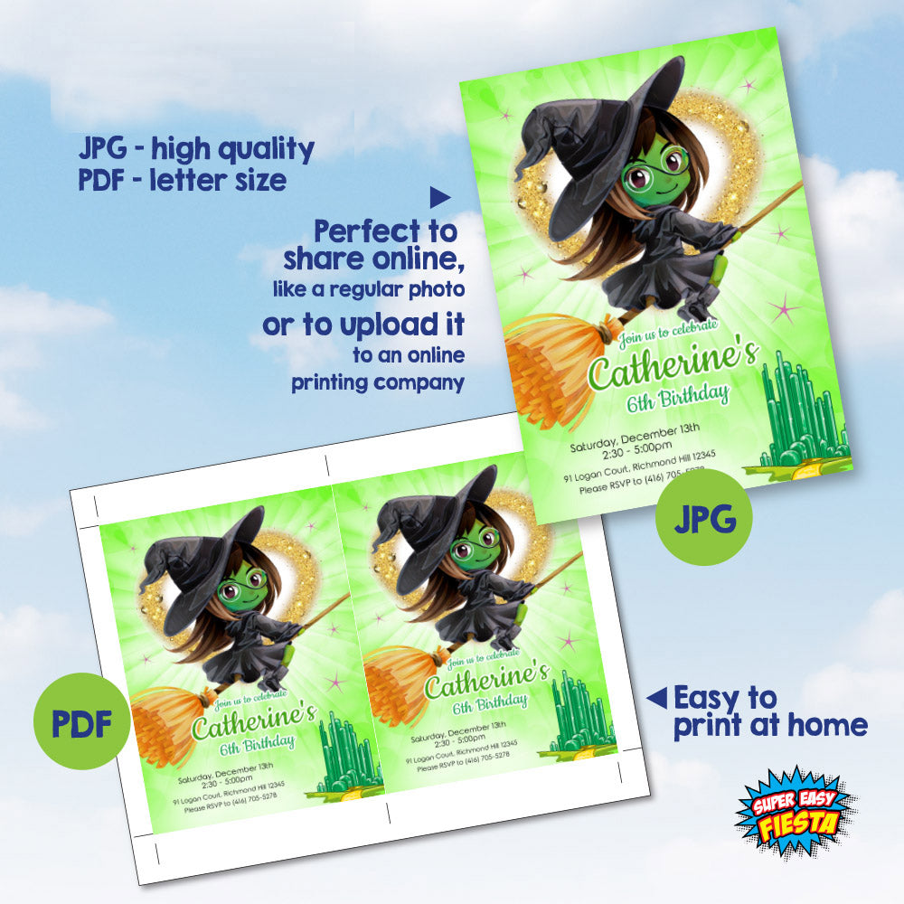 Wicked Elphaba Witch Birthday Invitation, Green witch Wicked party invitation 1784IN